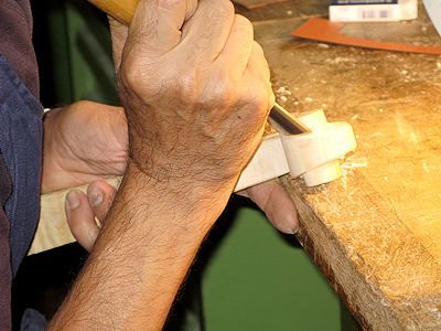 In der Geigenbauschule in Brienz herrscht geschäftiges Treiben: Fünf Geigenbauer stehen in der Werkstatt, beugen sich konzentriert über ein kleineres oder grösseres Stück Holz, wechseln einige Worte, bitten einen Kollegen um ein Werkzeug, sprechen sich ab. Hier in der Geigenbauschule soll bis am Samstagabend im Rahmen der Musikfestwoche Meiringen eine Geige entstehen. Was sonst Wochen dauert, wollen die fünf Profis in einer Woche schaffen. Am Montag haben sie ihre Arbeit aufgenommen. Hans Rudolf Hösli, Direktor der Geigenbauschule, kümmert sich am frühen Montagnachmittag um die Anpassung der Zargen: Nachdem er die Eckklötze zurecht gehobelt hat, biegt er die filigranen Holzstreifen, die später die Seite der Geige darstellen werden, auf dem heissen Eisen und leimt sie mit den Eckklötzen zusammen. «Bei dieser Geige stehen wir unter Zeitdruck» so Hösli, «deshalb arbeiten wir mit kleinen Hilfen.» Mit einem einfachen Haarfön trocknet Hösli den Leim und fixiert die Biegung.